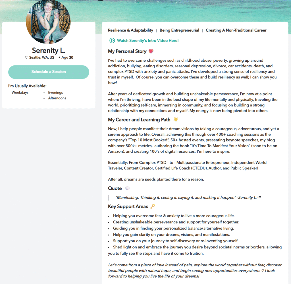 Now, I help people manifest their dream visions by taking a courageous, adventurous, and yet a serene approach to life. Overall, achieving this through over 500+ coaching sessions as a company’s “Top 10 Most Booked” across 5+ years, 50+ hosted events, presenting keynote speeches, my blog with over 500k+ metrics, authoring a book, and creating 100’s of digital resources; I’m here to inspire. After all, dreams are seeds planted there for a reason.